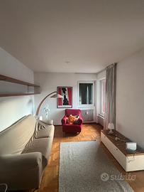 Completa l'appartamento una cucina attrezzata con forno e lavastoviglie, un soggiorno con divano e poltrona e un piccolo balcone. Inoltre è presente una camera doppia con bagno (già occupata) al piano superiore.