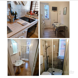 Bagno con doccia e cucina con piano a induzione, forno, microonde e lavatrice.