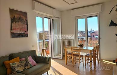 Una cucina abitabile, con lavastoviglie, forno e primo accesso sul balcone, infine la zona giorno con il secondo accesso all' ampio balcone angolare!