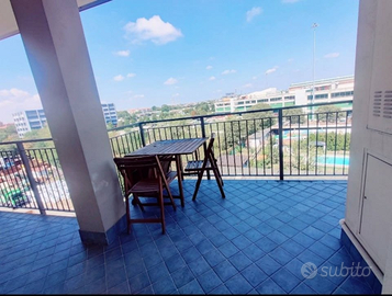 Spazi condivisi con altri coinquilini, cucina attrezzata, bagno finestrato e terrazzino che nella bella stagione diventa un'estensione della zona living.