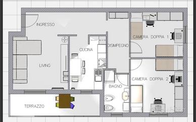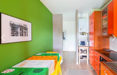 In appartamento con grande living e cucina, stanza in condivisione (singola da valutare ad altro prezzo e in talune condizioni) ambiente di 100mq, terrazzo esterno vivibile con tenda solare e arredo esterno.