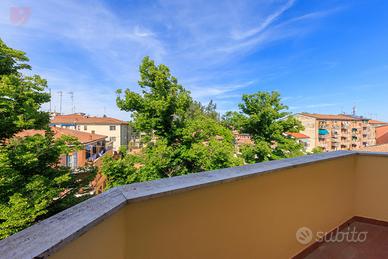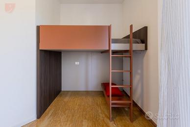 Il letto soppalcato con materasso ortopedico offre un riposo confortevole e lascia tutto lo spazio per la camera. La scala serve anche come asta portabiti a giorno, unendo praticità e stile. L'armadio ad un'anta è integrato con cassettiera e ripiani, ottimizzando l'organizzazione. Completa la stanza una scrivania di dimensioni adeguate con sedia BABILA Pedrali, oltre a un attaccapanni a parete, utilizzando intelligentemente ogni angolo disponibile. Inoltre, il balcone offre un luogo piacevole per rilassarsi all'aria aperta.