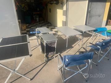 2tavoli 2 misure, 1 tavolo smontabile a sacca,i tavolo porta cucina con ripiani, 2 sedie regista, cucina 2 fuochi super potente inox, parafiamma cucina inox,regolatore e tubo gas cucina, lettino mare, 2 stuoie mare foto cucina se interessati ve le mando