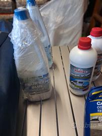 Vendo vari accessori per camper, telo esterno, cassetta per acque grigie, acqua Kem, calze per pneumatici, sedie ed altro ancora, in blocco o singolarmente