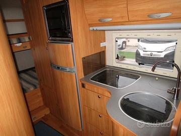 6 posti lettocon matrimoniale in mansarda, semi-dinette con sedili cabina girevoli, trasformabilein matrimoniale e maxi letto a castello posteriore trasversale con letti larghi110 cm e trasformabile in grande garage portamoto.
