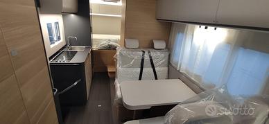 Classica configurazione con dinette trasformabile in letto matrimoniale, matrimoniale sopra la mansarda e letto matrimoniale in coda ad altezza regolabile vanno ad offrire