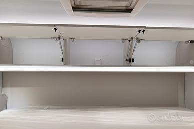 Dotazioni extra: Tessuti Ophelia, Freno di stazionamento elettrico, Antenna radio AM/FM+DAB nello specchio laterale dx, Serbatoio gasolio maggiorato 90 Lt, Retrocamera su dispaly Fiat, Fiat Lounge Pack + radio, Fiat Pack Alu Wheels 1, Oblò panoramico sopra cupolino/mansarda, Portabombole integrato 2 x 11 kg, Barre portatutto sul tetto con scaletta esterna, Porta ingresso (650 mm) con chiusura centralizzata, finestra, zanzariera e pattumiera, Convertitore DC/DC, Alloggiamento retrocamera, Riscaldamento Truma Combi 6 (Gas) con boiler, Oscurante parabrezza + vetri laterali cabina plissettati, Filtro gas Truma.