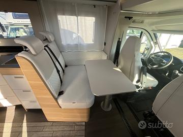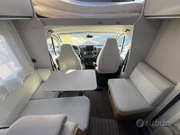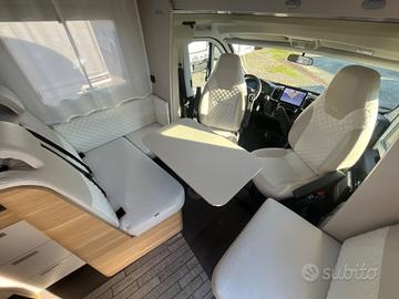 La disposizione interna prevede un ampio living con dinette avanzata , divano laterale e sedili guida girevoli .