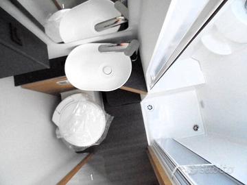 Dinette a ''elle'' con sedili girevoli bagno con doccia sperata ma in unico ambiente, cucina ad angolo spaziosa con frigo grande, armadio alto per uno stivaggio comodo + due armadi ai piedi dei lettini.