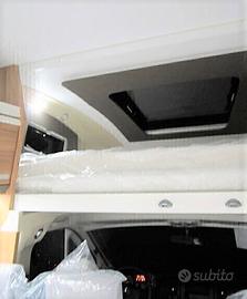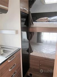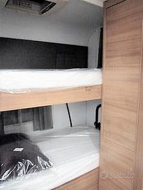 Mansardato 7 posti letto con castello in coda Disposizione: doppia dinette con possibilità di trasformare la piccola in divanetto oppure letto da adulto, cucina lineare, frigo slim 142 lt, bagno con doccia separata, garage posteriore a volume variabile. Meccanica: Fiat 2.3 140 cv con clima. Dotazione: portapacchi con scaletta, chiusura centralizzata porta cellula, oscuranti remis plissettati in cabina, serbatoio grigie coibentato e riscaldato, ruote da 16", cruise control. Accessori: Tendalino, porta bici, pannello solare, impianto tv, retrocamera, sosp. pneumatiche, batteria NDS TEMPRA 150 ah, inverter, antifurto, cerchi in lega, sensori park, attacco gas esterno, cerchi in lega.