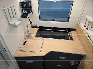 Il bagno separato dalla doccia garantiscie uno spazio molto ampio, grazie alle sue due porte può diventare un ambiente condiviso accessibile da tutto l'equipaggio.