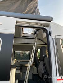 Configurazione: 5 posti letto (basculante posteriore elettrico + tetto a soffietto, kit dinette), Bagno Vario con doccia separata, Frigo a compressore Thetford 85L.