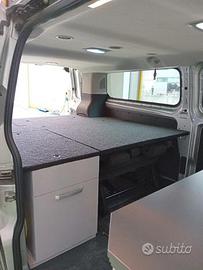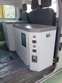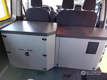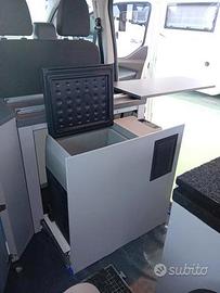 Arredamento fattura artigianale di buon livello composto da: contenitore frigorifero a pozzetto con cestello estraibile e piano di appoggio scorrevole, mobiletto per lavello con lavello e doccetta con tanica acqua e recupero, mobiletto contenitore wc con Wc porta potti Thetford Frigorifero pozzetto 12v Materiale rimosso da un minivan completo di tutti gli accessori