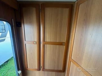 Gli interni riflettono tutta la filosofia Arca, con un mobilio estremamente curato, robusto e di qualità superiore, accompagnato da tappezzerie ben conservate che trasmettono immediatamente una sensazione di calore e accoglienza. La zona living è composta da una spaziosa dinette classica, confortevole e conviviale, affiancata da numerosi spazi di stivaggio intelligenti e ben distribuiti. La cucina, pratica e funzionale, è dotata di piano cottura, lavello e frigorifero, offrendo tutto il necessario per vivere il viaggio in totale autonomia.