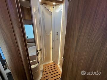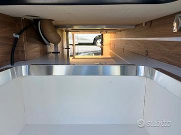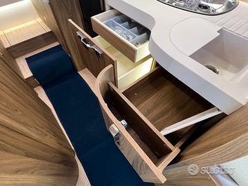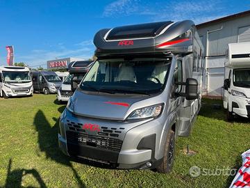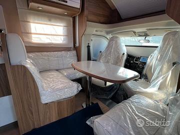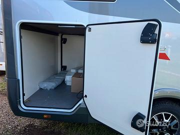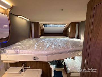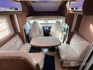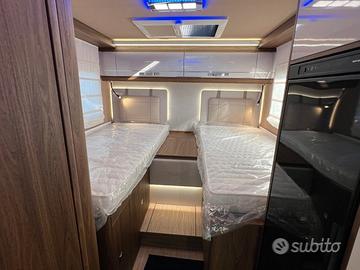 Supendo camper semintegrale ARCA 6.99 metri con letti gemelli su garage, letto basculante matrimoniale elettrico in zona giorno e comodo bagno a volume variabile.