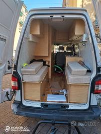 Furgone VW T5 tetto alto passo lungo del 2011, motore TD 2000cc 140cv 4 ruote motrici permanenti per una eccezionale stabilità anche a forte andatura, reimmatricolato camper per 3 persone dopo l’allestimento nel 2015, completo di doccia e wc in locale separato, 2 fuochi, frigo con congelatore a pozzetto, boiler per acqua calda, riscaldamento Webasto, aria condizionata in cabina guida, pannello fotovoltaico collegato alla batteria servizi e motore per una indipendenza di 3 o 4 gg, dinette trasformabile in letto con materasso da 20 cm, gancio traino omologato 2500kg, carrozzeria perfetta, sostituita frizione in concessionaria VW con garanzia, gomme buone, vendo per mancato utilizzo infatti da più di 4 anni lo utilizzo date le piccole dimensioni solo come auto, si parcheggia facilmente. Rispondo solo a realmente interessati che capiscono l’occasione per un doppio utilizzo auto e camper.