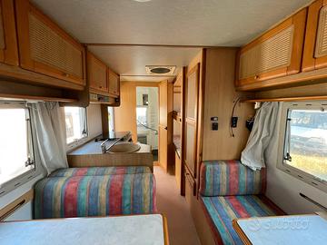 7 Posti Letto (di cui 5 SEMPRE PRONTI - IDEALE x Famiglie di 4/5 Persone) e 7 Posti Omologati Viaggio; Scocca in Poliestere ad Altissimo Isolamento; Grande Zona Living con 2 Grandi Tavoli e fino a 8 Posti a Sedere x Pasto; Traslazioni Metalliche su Guide x Cassapanche; Serbatoio Acqua Chiara da 150 lt.; Lunghezza SOLO 6.60; Larghezza SOLO 2.20; Altezza SOLO 2.89; Inurtato; Gomme Nuove e Batterie Nuove; Riscaldamento Statico a Gas Senza Ausilio di Corrente Elettrica; Cappa Aspirante Cucina.