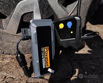 Il Jump Starter ha un'uscita CC da 12 V/10 A e un convertitore per accendisigari, che può essere collegato a un compressore per gonfiaggio gomme in modo pratico.