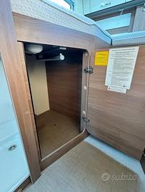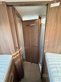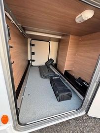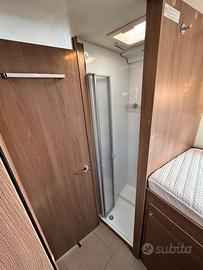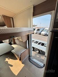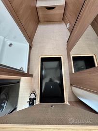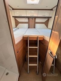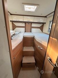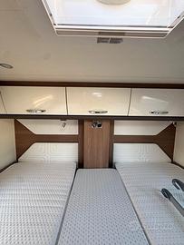 Camper di alta gamma con letti gemelli posteriori, garage ampio, bagno con doccia separata e living accogliente con dinette FACE TO FACE.