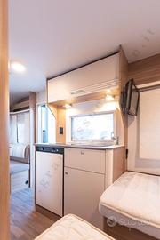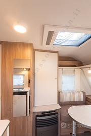 Caravan di pregevole fattura con tetto e pareti frontale e posteriore in vetroresina antigrandine, interni moderni e dalle finiture calde e accoglienti.