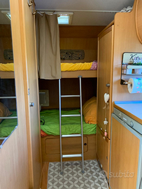 Camper sempre rimessato con letto mansardato e letti a castello da 90 cm di larghezza in coda. Doppio serbatoio acque bianche, pannello solare, impianto tv, retrocamera, porta bici da 4 posti, veranda e antifurto.