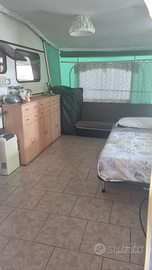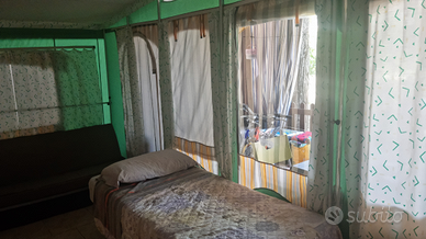 La struttura e' di recente costruzione, composta da roulotte con letto matrimoniale più letto singolo, dotata di armadio, comodini pensili a sportello, condizionatore indipendente, avantenda con letto singolo, divano letto (più due letti pieghevoli a libro con materassi inclusi), mobile dispensa con sportelli e cassetti. L'impianto di condizionamento raffredda in maniera efficace sia la roulotte sia l'avantenda, dotata nche di aperture finestra a zanzariera. All'esterno abbiamo vano cucina dotato di stufa a gas 4 fuochi, 2 dispense e frigo familiare e forno elettrico. Il bagno è ad uso esclusivo della postazione, dotato di doccia e wc, l'acqua sanitaria viene riscaldata mediate pannello solare, capienza 500 litri. Zona living dell'area ampia e funzionale. L'intera superficie è pavimentata, con lastre esterne e piastrelle all'interno. Viene venduta così com'è arredata, con 2 tavoli, 6 sedie fisse più altre 6 pieghevoli, ventilatore a soffitto, deumidificatore. L'intera tendaggio è stato rifatto nuovo due anni fa, ed esternamente abbiamo una maggiore protezione data da tende antipiogia e anti vento anche esse rifatte nuove di colore bianco.