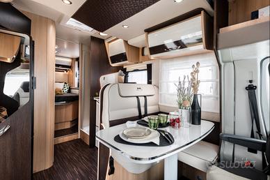 Caravan dotato di tutto il necessario per il campeggio: tavoli sedie e stoviglie per la cucina.