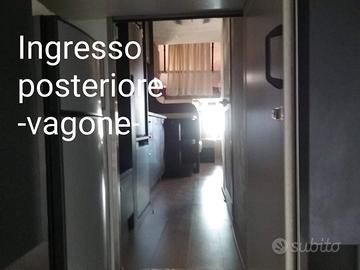 Autocaravan con avancorpo sopra la cabina con panche omologate complete di cinture di sicurezza, tavolo con panche attrezzabili a letto + cuccetta laterale a letto, cucina completa evTV, bagno completo di wc, bidet, doccia e lavandino e camera matrimoniale sopraelevata con armadiatura e TV.