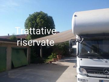 Autocaravan con avancorpo sopra la cabina con panche omologate complete di cinture di sicurezza, tavolo con panche attrezzabili a letto + cuccetta laterale a letto, cucina completa evTV, bagno completo di wc, bidet, doccia e lavandino e camera matrimoniale sopraelevata con armadiatura e TV.