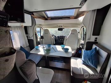 Posti omologati4, posti letto 4+1 (di cui 1 basculante singolo), posti a mangiare 5, aria condizionata, cappa aspirante, frigo grande trivalente, clima motore, comandi al volante, cruise control, radio, luce sterna, pannello solare, TV, retro camera sensore di parcheggio, tendalino, doppia batteria di servizio. Lunghezza 6,99mt, larghezza 2,31mt.Fiat Ducato 140 CV.