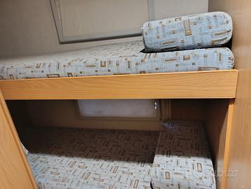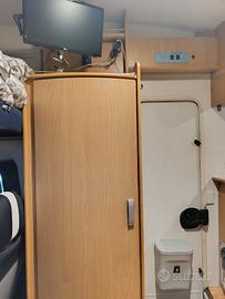 il camper mansardato a 6 posti letto è provvisto di stufa Truma, frigo trivalente TV LCD con Fire now e antenna TV, panello fotovoltaico, condizionatore cabina, tendalino esterno e portabici.