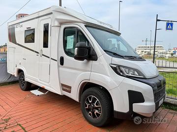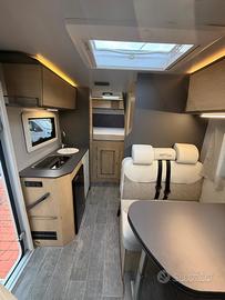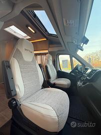 CAMPER SEMINTEGRALE GIOTTILINE COMPACT C60 - Perfetto equilibrio tra compattezza esterna e comfort interno NUOVO AL PREZZO DI UN USATO Tuo senza permuta a €56.000 (anziché €62.490). Disponibile anche con finanziamento a tasso fisso fino a 180 mesi Lunghezza 5,99 m - Larghezza 2,15 m - Altezza 2,80 m 4 posti viaggio - 3 posti letto Letto matrimoniale trasversale posteriore 131 x 202/198 cm Dinette trasformabile in terzo letto Meccanica Peugeot Boxer 2.2 - 140 CV PACK PRIVILEGE COMPACT Cerchi in lega da 16", foderine cabina coordinate, porta cellula XL con chiusura centralizzata, radio 6.8" con Android Auto e Apple CarPlay, retrocamera HD, fari posteriori a LED, Skyview panoramico, volante e pomello del cambio in pelle. DOTAZIONE DI SERIE Climatizzatore cabina, ESP, Traction, Hill Holder, Hill Descent, Start & Stop, Cruise Control, fendinebbia, retrovisori esterni elettrici, paraurti verniciato in tinta, luce esterna a LED, finestre con telaio a filo carrozzeria, gradino esterno elettrico, zanzariera porta cellula, attacchi Isofix, Midi Heki 700×500, serbatoio acque grigie riscaldato, comando Truma CP Plus.