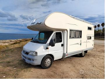 Camper Elnagh mansardato Super D 105, anno 2006, motore Fiat 2.3 JTD, km. 97.000 circa, posti omologati e posti letto 6, letto matrimoniale in mansarda, letto matrimoniale ricavabile in dinette e 2 letti a castello, cappa aspirabile, forno + scaldavivande, frigo grande, turbovent, clima telair in cellula, boiler truma per acqua calda, riscaldamento webasto a gasolio, bagno con doccia separata, pannello fotovoltaico, doppio vano bombole, sensori di parcheggio posteriori, inverter, retrocamera con monitor, portabici a 3 posti, tendalino, impianto TV con antenna, trio gas.