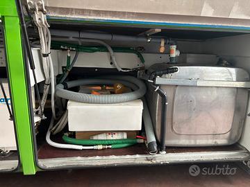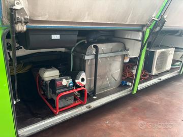 -UNA cisterna per acque bianche da 500 LITRI alimentata da pompa elettrica funzionante con due batterie da 380 Ampere separate da quelle della corriera, che si possono caricare anche in campeggio con un caricabatterie a parte o in movimento dai generatori della corriera
