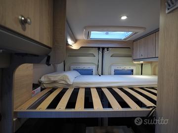 Può trasportare internamente una ebike o due bici pieghevoli. Si hanno sempre pronti due posti a sedere in dinette e un posto letto, il letto singolo è estensibile e diventa matrimoniale. La dinette può essere rapidamente trasformata in un terzo letto. Con un accessorio fornito compreso nel prezzo, rinunciando al trasporto della bici internamente, si può ottenere un quarto posto a dormire, due matrimoniali cioè, sovrapposti.