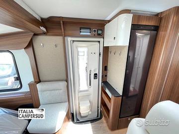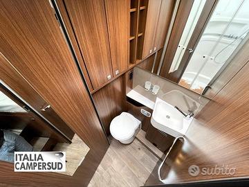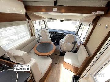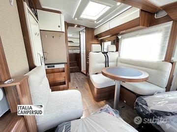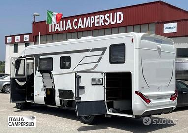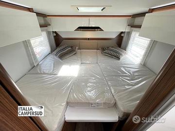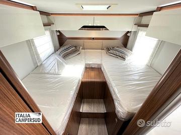 Motorhome Top Di Gamma Con Un Livello Qualitativo Assoluto con Letti Gemelli In Coda e La Possibilita' Di Trasformarlo In Un ampio letto matrimoniale una zona giorno living con tavolo centrale Tondo e sedili cabina girevoli inoltre un grande letto matrimoniale basculante nella zona anteriore e una cucina attrezzatissima, doppio pavimento con botole di accesso interne e bagno con Doccia Separata