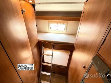 Mansardato 6 Posti Letto Con 2 Letti a Castello In Coda Trasversali e Garage a Volume Variabile Una Cucina In Linea Attrezzata ed Una Dinette Grande Living Con Tavolo Centrale e Divanetto Laterale e Sedili Girevoli Cabina, Un Maxi Letto Matrimoniale In Mansarda ed Infine Un Comodo Bagno Con Doccia Separata