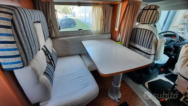 Funzionale la zona giorno, con una ampia semidinette integrata con le poltrone della cabina, girevoli. Dotato di letto basculante sopra la dinette che, unito al Sofa Extension System, porta a 5 i posti letto (cinque adulti) e a 5 posti a sedere in dinette omologati.