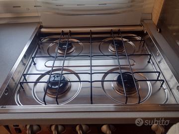 Frigo trivalente con kit ventole raffreddamento e cucina 4 fuochi ampliata con mensola lato porta.