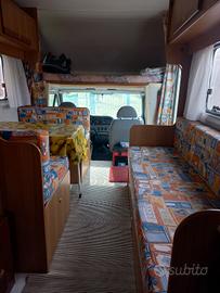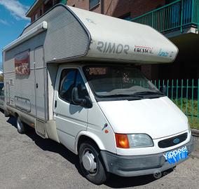 camper mansardato rimor modello Unico con cucina e bagno in coda e un divano di fronte alla dinette che lo rende ampio e molto conviviale; omologato 6 persone con brandina bimbi smontabile sopra divano , portabici, tenda Fiamma Pro tutto originale. Nessuna modifica. Motorizzato Ford Transit gemellato trazione posteriore con 56000 km originali, diesel 2500 aspirato, sempre rimessato e usato solo per vacanze stanziali. Manutenzioni effettuate non per usura ma solo per vetustà: olio, filtri, distribuzione, pneumatici. Quasi come nuovo dentro e fuori, da vedere e provare.