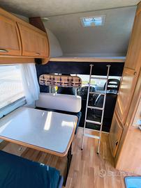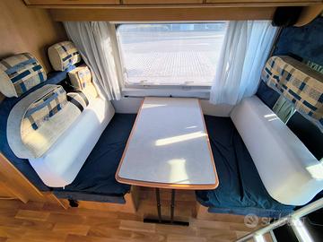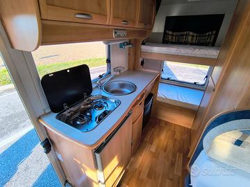 Letto matrimoniale in mansarda e letto a castello in coda, il terzo letto matrimoniale viene creato nella dinette, frigorifero trivalente, bagno + wc a cassetta,