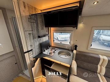 La configurazione con letto trasversale posteriore e letto basculante anteriore offre fino a 4 posti letto mantenendo vivibilità nella zona giorno.