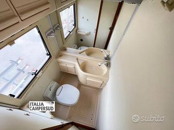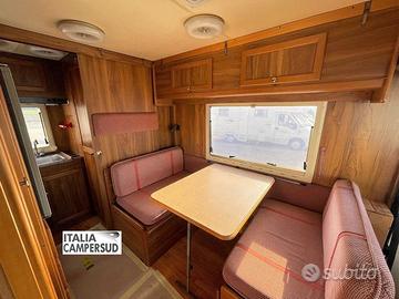 Motorhome 4/5 Posti Letto Con Letto Matrimoniale Basculante Anteriore Una Zona Giorno Con Dinette Grande Living e Tavolo Centrale e Una Cucina Ad Angolo Posteriore Fornitissima Con Bagno e Doccia