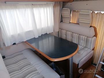 Montato su Ducato 2.8 JTD, km 73.000, tagliando e gomme Michelin, mansardato, lunghezza 7,26 metri, letto a castello , letto matrimoniale mansardato , più doppia dinette trasformabile in tre posti letti ulteriori, bagno con doccia separata, cucina attrezzata completa di gas, cappa, scaldavivande e forno, frigo completo di freezer, aria condizionata, tendalino e luce esterna, pannello fotovoltaico, rilevatore gas interno, riscaldamento webasto, impianto radio, portabici da 3.