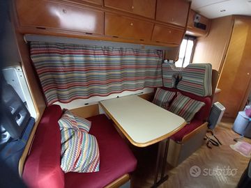Anno 2001 182000 km Sempre revisionato scadenza 03/27 Riverniciato con serigrafia sempre rimessa ti 6 posti letto 2 mansarda 2 dinette 2 letti a castello 6 posti viaggio Lunghezza 6.040 2 pannelli solari 110w 2 batterie servizio Antenna sat aut digitale terrestre+ TV 21" Telecamera posteriore+ telecamera wireless 5g Borta bici 2 posti Veranda Frigo Electrolux trivalente, stufa Trumatic, boiler, zanzariere, oscuranti Triogas sensore Wc a cassetta Doccia separata Sospensioni AL-KO con compressore Inverter Luci a led Gradino elettrico Antifurto volumetrico Gomme 4 stagioni . Condizionatore portatile mistralvan (eccezionale). A chi veramente interessa invierò altre foto.
