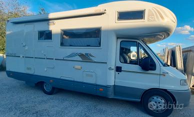 Camper Mobilvetta Icaro S7 su Ducato 2.8 jtd, lunghezza 6,80 metri. Cinque posti in viaggio e fino a sette posti letto, doppia dinette trasformabile in letti, 2 letti a castello in coda, 1 letto matrimoniale in mansarda, gavone capiente e variabile.