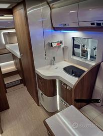 Motorhome TOP Di Gamma Con 4 Posti Letto Con Telaio Al-Ko. Doppio Pavimento Passante, Basculante Matrimoniale Anteriore e Da Una Zona Living Con Dinette Face To Face e Tavolo Centrale Con Sedili Cabina Girevoli Una Cucina Ben Attrezzata ed Infine comodi letti gemelli Ed Un Garage Con Portata 300 Kg nel quale è stato fatto un impianto di acqua calda e fredda per lavatrice 3 kg e Lavastoviglie piccola con 4 Coperti, 6 Programmi e controllo touch. Inoltre Un Bagno Con Doccia Separata. Acqua pulita 236 lt, doppia cassetta wc chimico