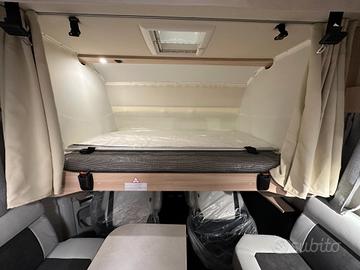 Lungo circa 7,40 m e omologato per 4 persone viaggio e notte, nasce su meccanica Fiat Ducato con telaio AL-KO ribassato, soluzione che garantisce stabilità, comfort di guida e grande capacità di carico. Il doppio pavimento passante migliora isolamento termico e spazio di stivaggio, rendendolo ideale per viaggi in tutte le stagioni.