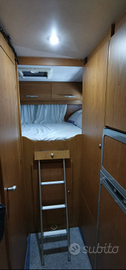 Camper con letto basculante sopra la dinette e letto trasversale in coda bagno con doccia separata e garage grande