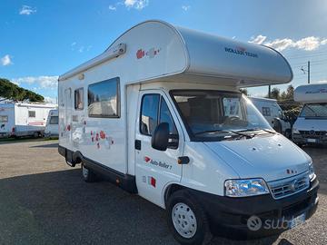 Modello : Auto Roller 7 Anno: 06/2005 Meccanica: Fiat Ducato 2800cc 127cv Km: 150.000 Lunghezza: 681 Larghezza: 225 Posti Omologati: 7 Posti letto: 7 Dotazioni di serie: Vetri e specchi elettrici , Chiusura porte cabina centralizzata , Bagno con doccia separata , Cinture sicurezza per ogni passeggero Accessori: Veranda , Portabici , Clima cellula , Wiesa , Pannello solare , Filo diffusione, doppia cuscineria Struttura esterna: Alluminio Note: interamente verniciato 02/2026, Frizione e Distribuzione fatte 12/2025
